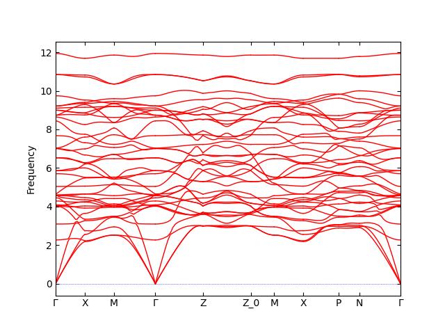 phonopy-bandplot -o phonopy-bandplot.jpg这将生成一个名为phonopy-bandplot.jpg的文件,其中包含了声子谱的图像。但是这个图太过简陋,如下所示,建议将数据下载到本地进行绘图